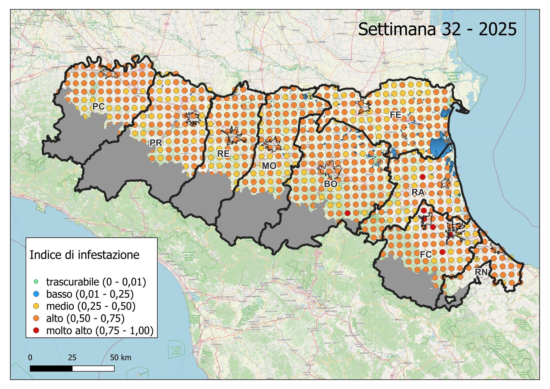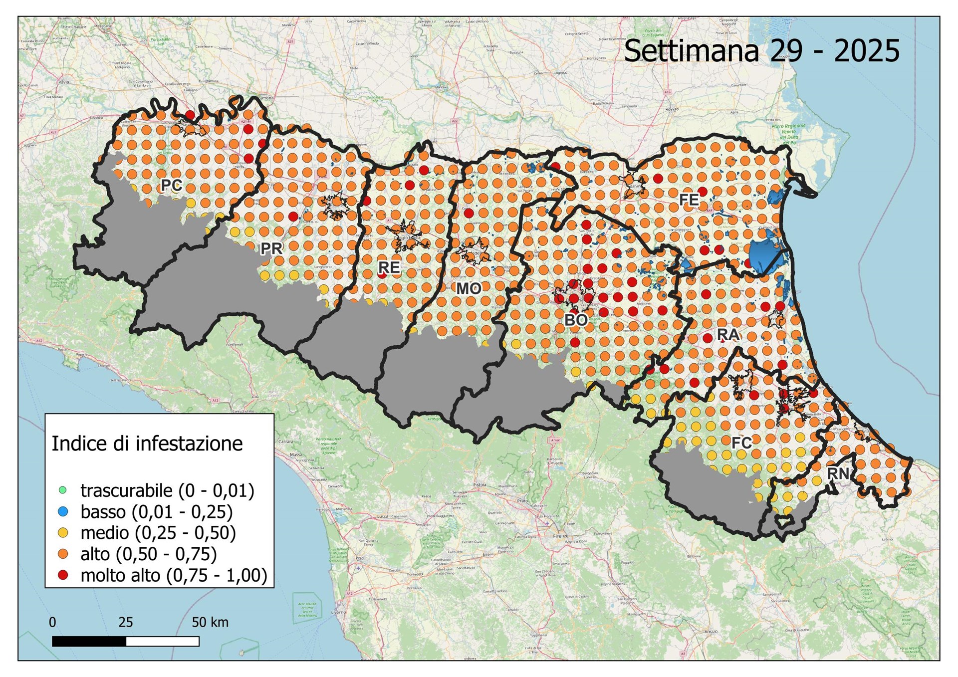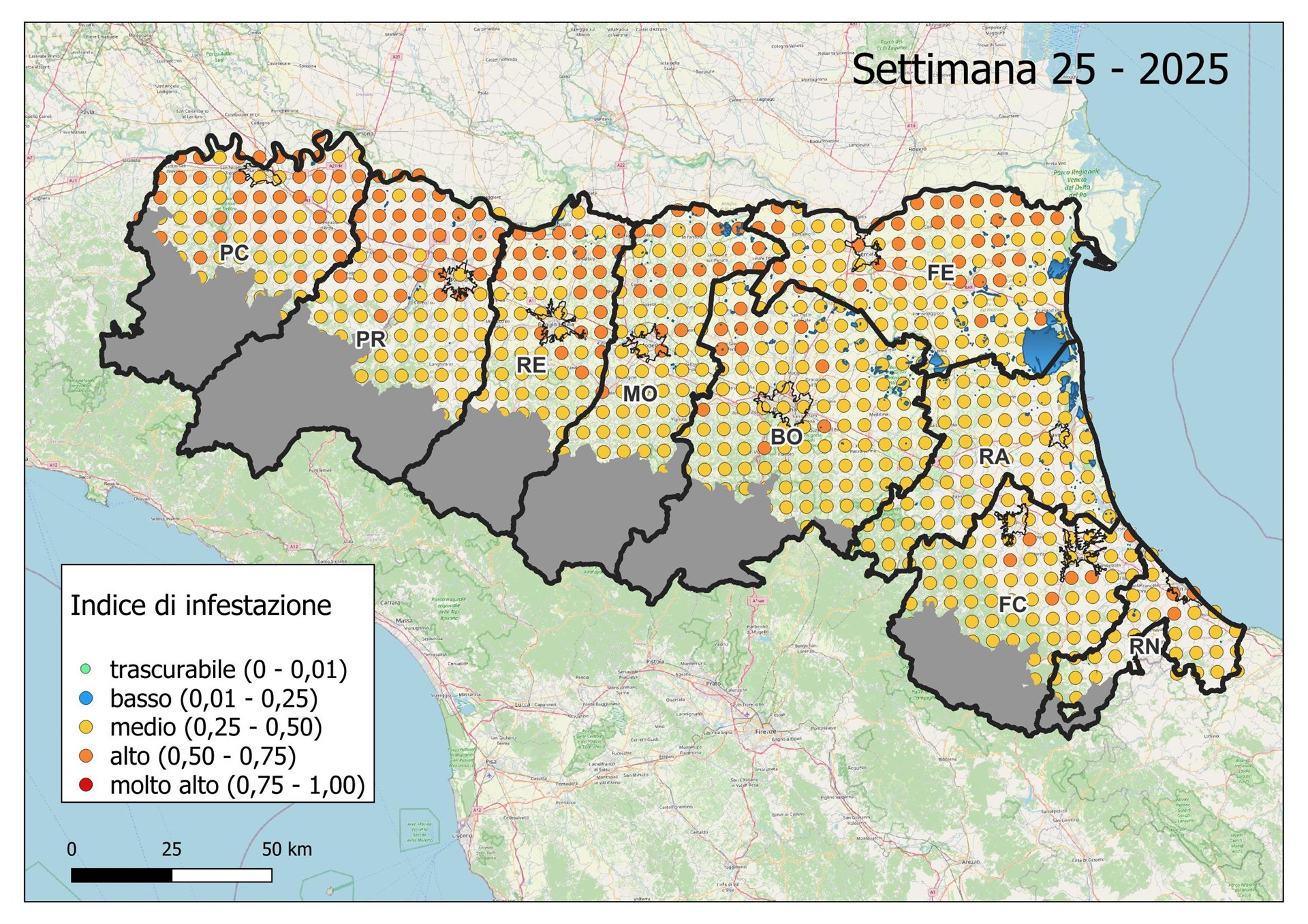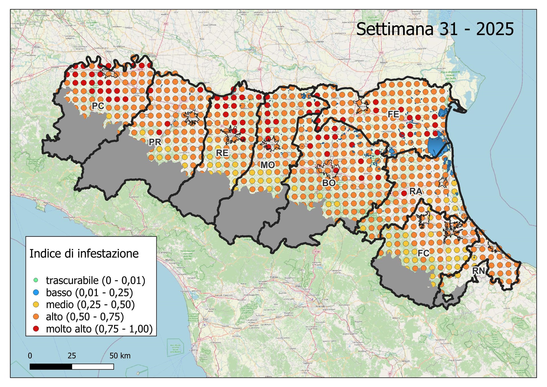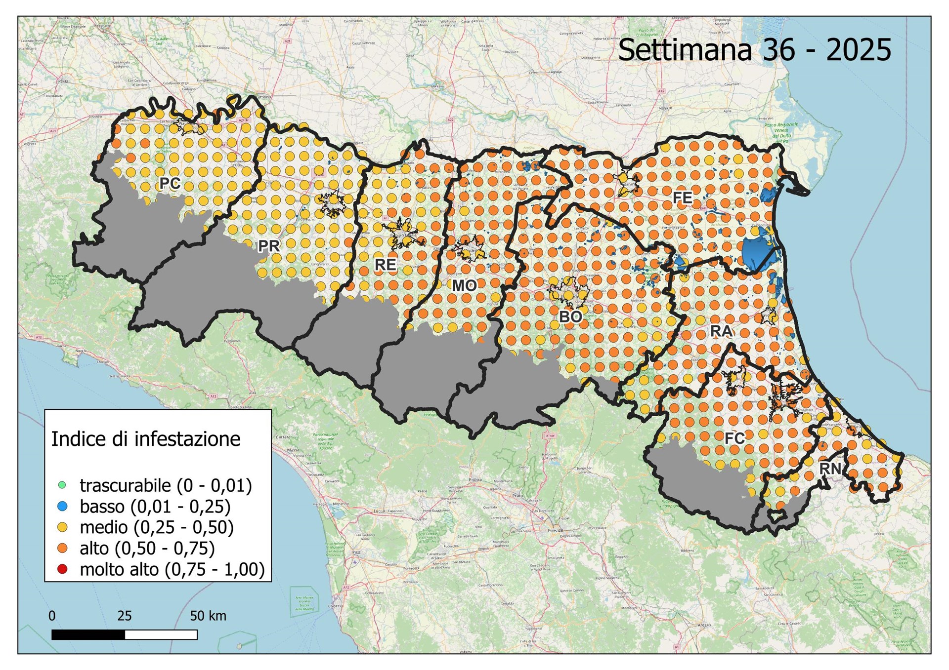 Le seguenti mappe mostrano con colori graduati l'Indice di Infestazione settimanale calcolato dividendo il numero di uova previsto tramite modello con il numero medio del massimo di uova calcolato negli ultimi 5 anni dai dati di monitoraggio con ovitrappole.