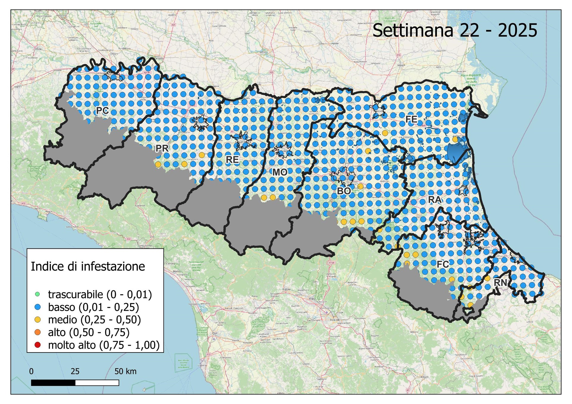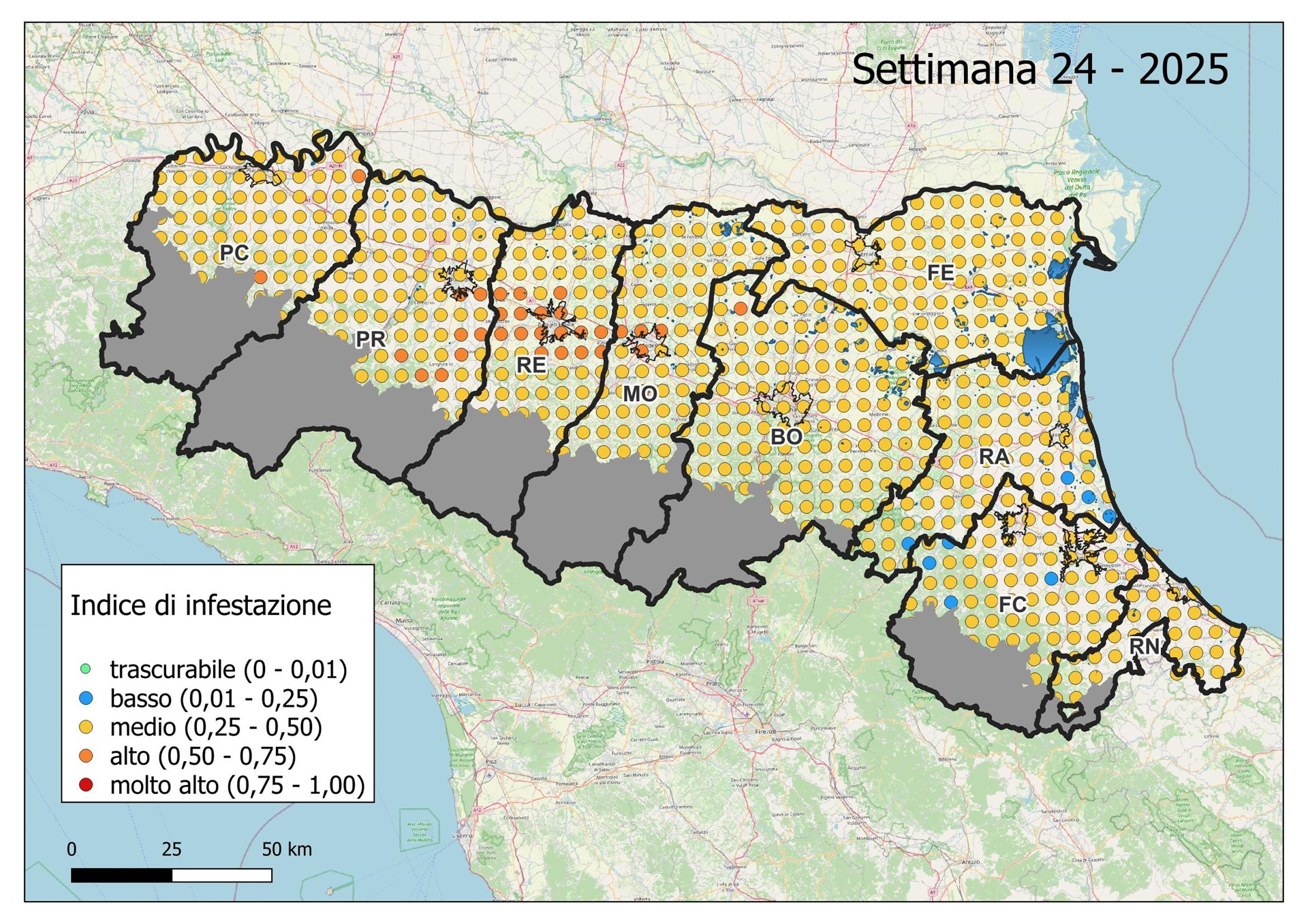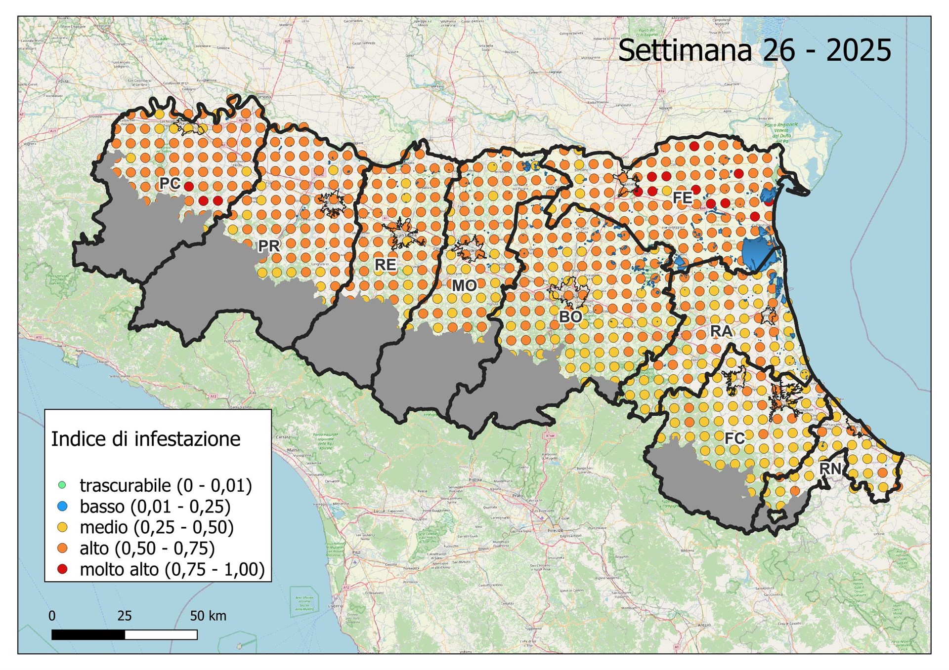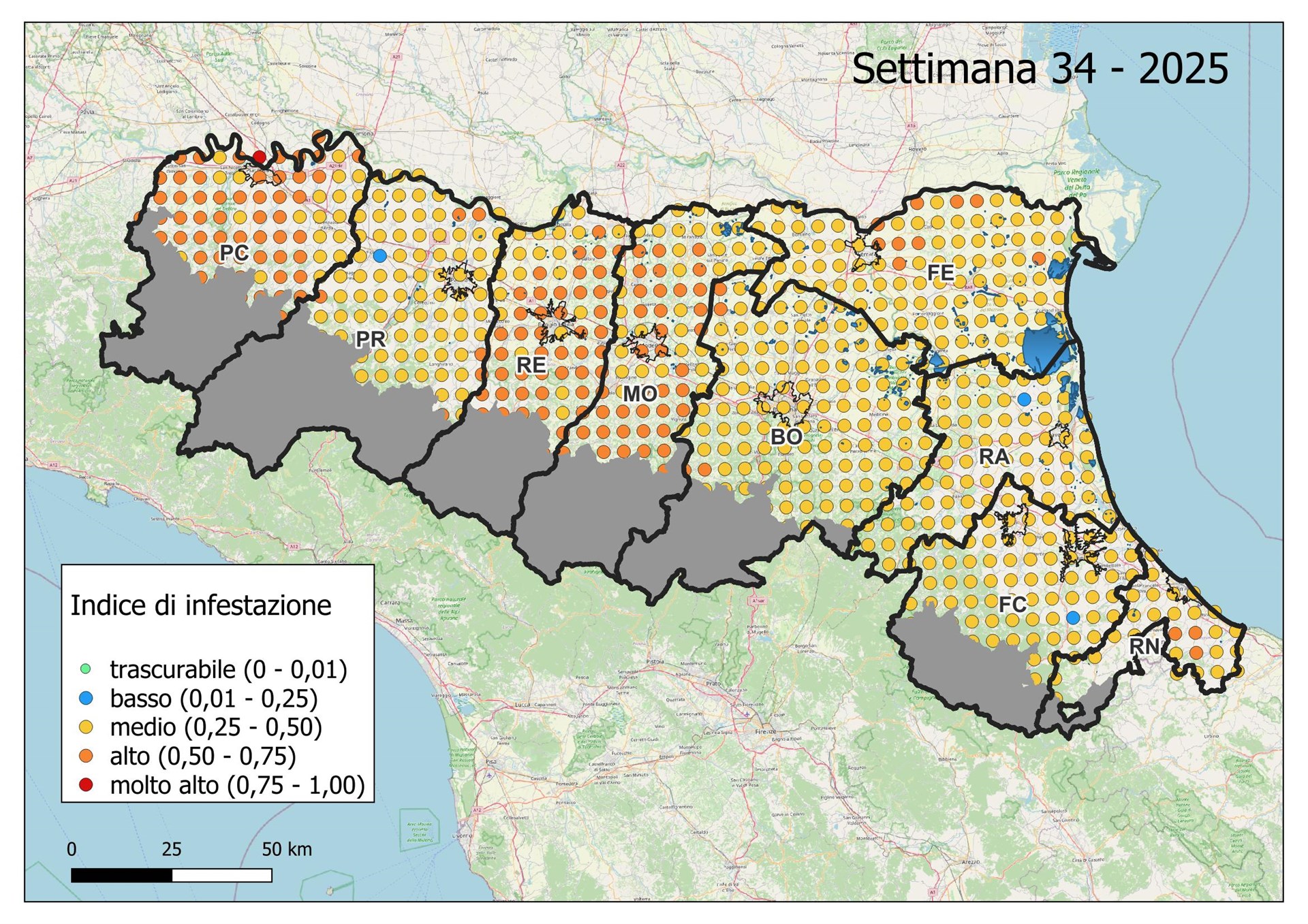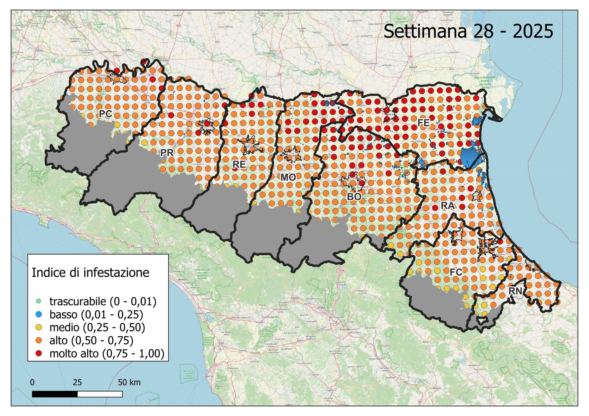Le seguenti mappe mostrano con colori graduati l'Indice di Infestazione settimanale calcolato dividendo il numero di uova previsto tramite modello con il numero medio del massimo di uova calcolato negli ultimi 5 anni dai dati di monitoraggio con ovitrappole.