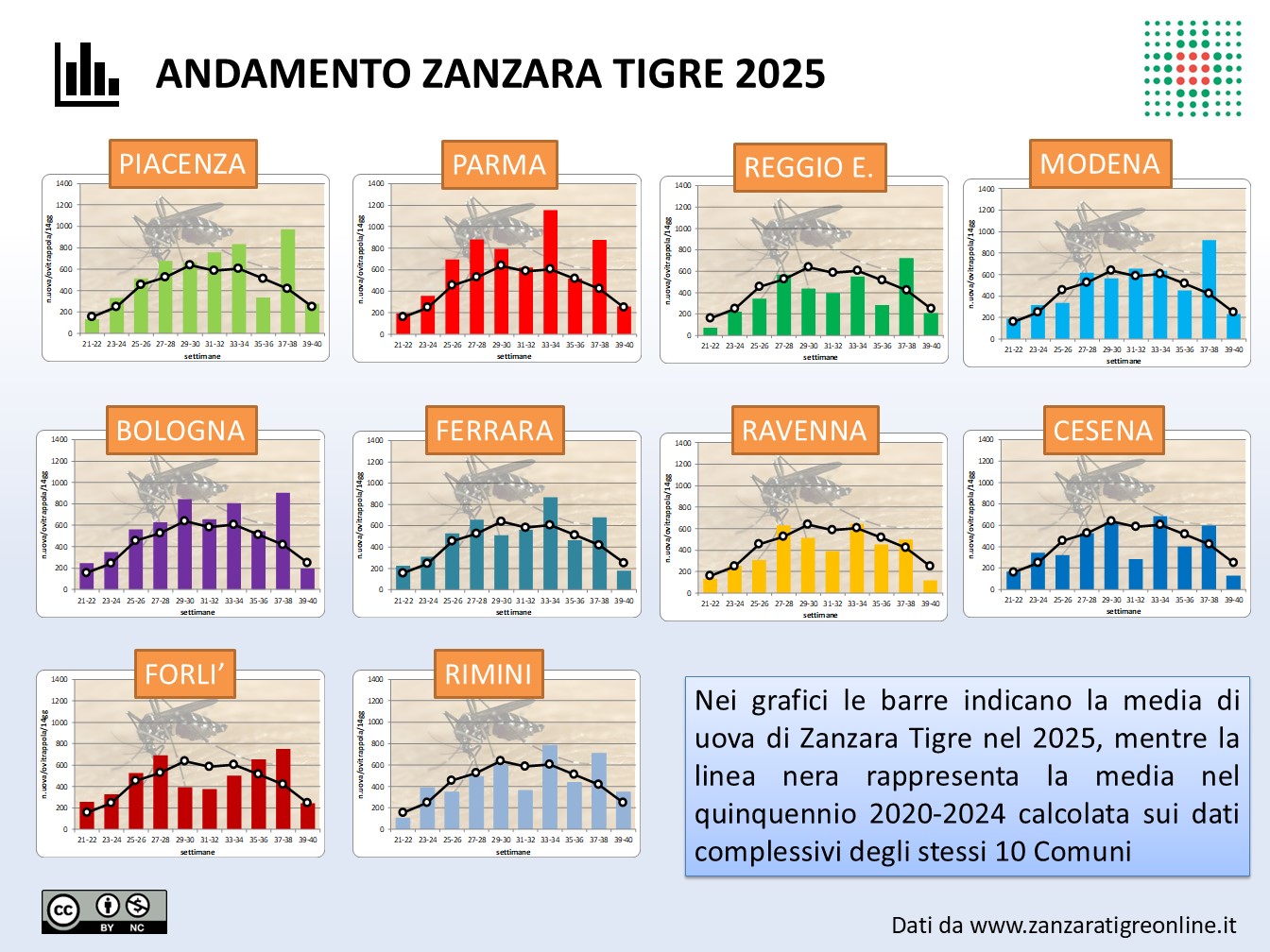 Nel corso della stagione estiva 2025 i laboratori ARPAE di Modena e Forlì hanno conteggiato complessivamente 3.572.266 uova di Zanzara Tigre, con un aumento di circa 5,9% rispetto al 2024.