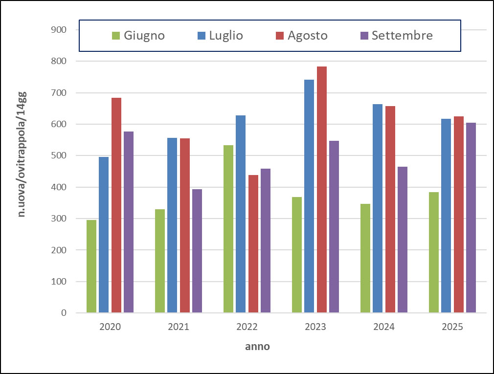 Il confronto con il dato storico delle trappole CO2 mostra un significativo aumento del numero di adulti nelle stesse settimane in cui si sono verificati i picchi di ovideposizione (luglio, seconda metà di agosto e metà settembre).