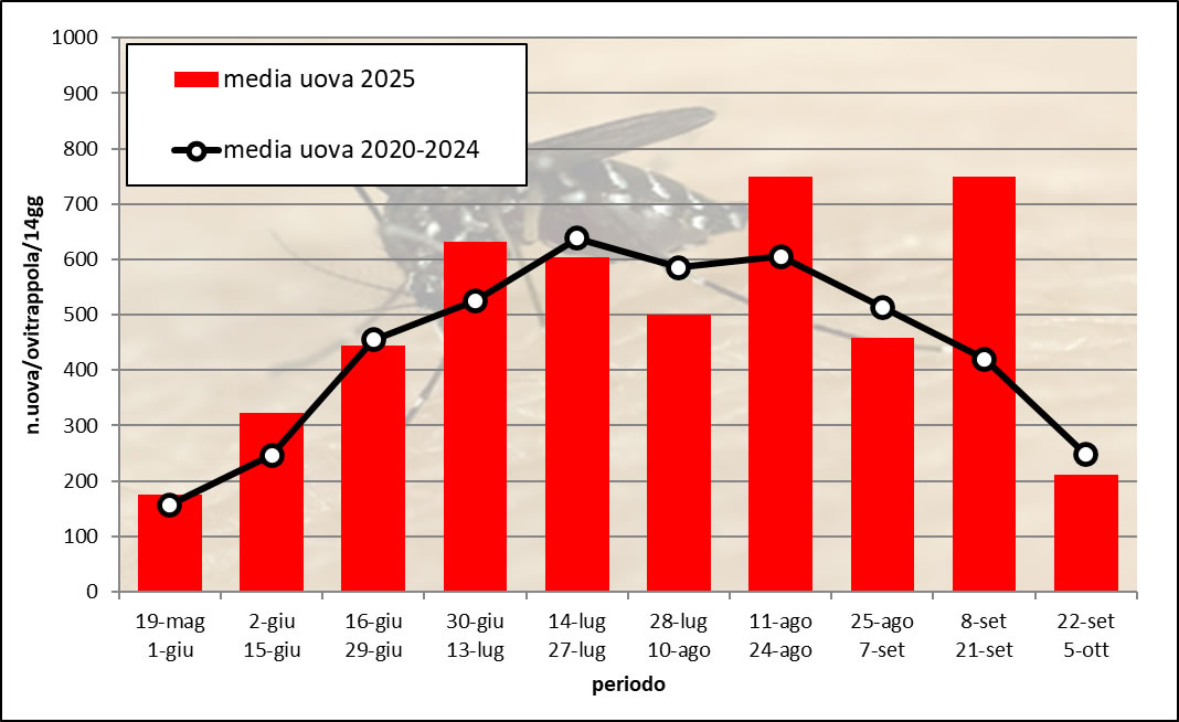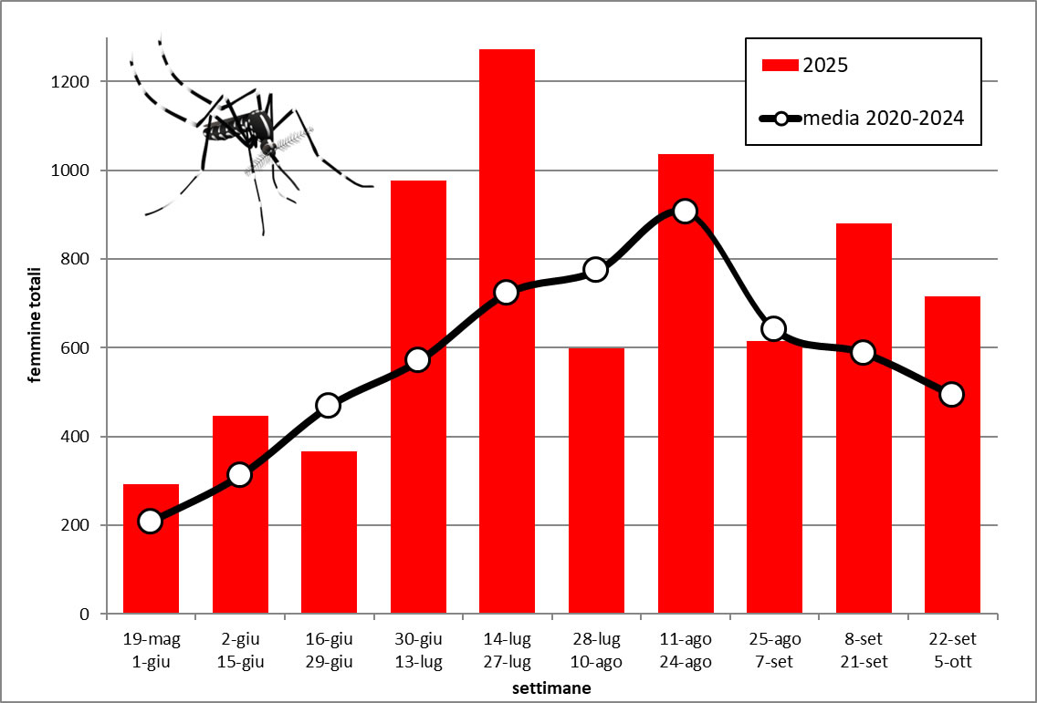 Nella seconda metà di agosto la popolazione ha ripreso a crescere (+24% rispetto alla media storica), per poi raggiungere un nuovo picco tra metà e fine settembre (+79%), grazie a condizioni climatiche che hanno favorito la sopravvivenza degli adulti. Tra fine settembre e inizio ottobre, le temperature inferiori alla media stagionale hanno determinato un rapido calo della popolazione.