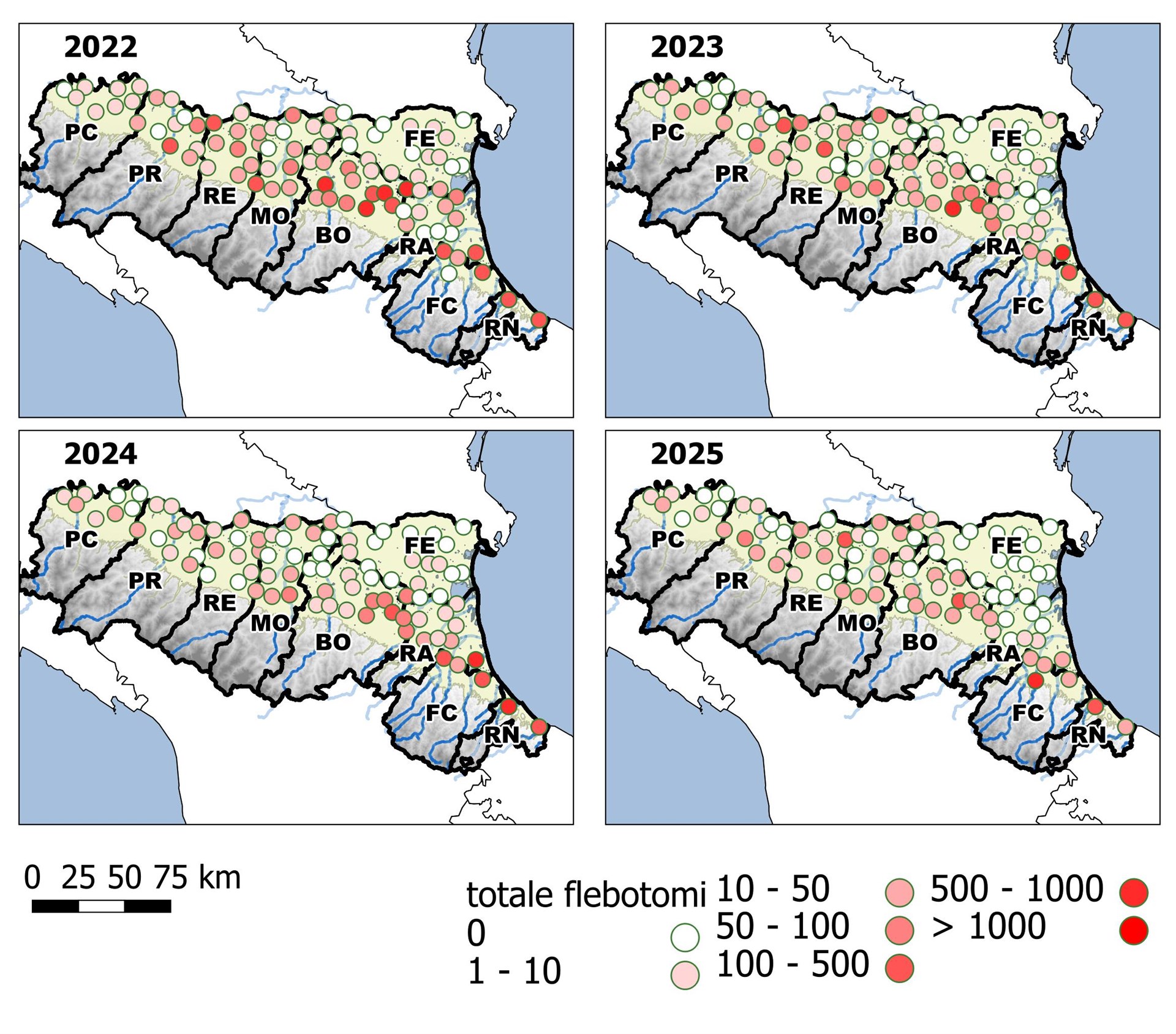 Un numero medio più rilevante di flebotomi calcolato nei 4 anni di analisi è stato registrato nelle province di Bologna, Forlì-Cesena, Modena e Rimini, mentre le aree di bassa pianura si confermano poco favorevoli.