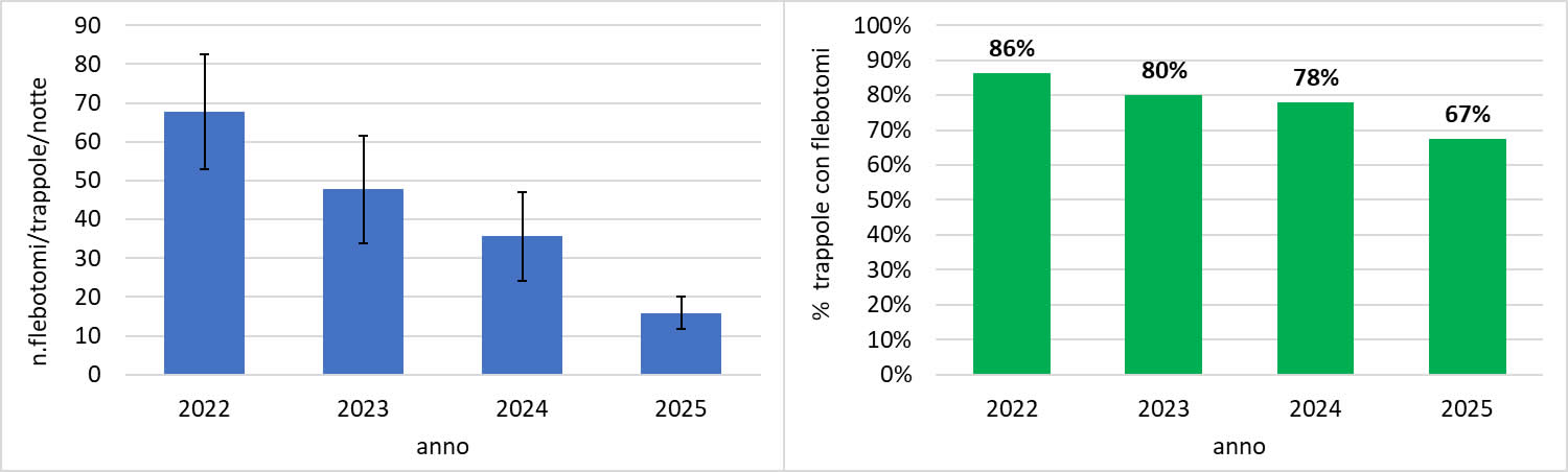 Dopo una crescita del numero di flebotomi registrata dal 2018 al 2022, si evidenzia una flessione della densità di flebotomi in pianura fino al 2025 probabilmente legata anche a condizioni climatiche sfavorevoli.