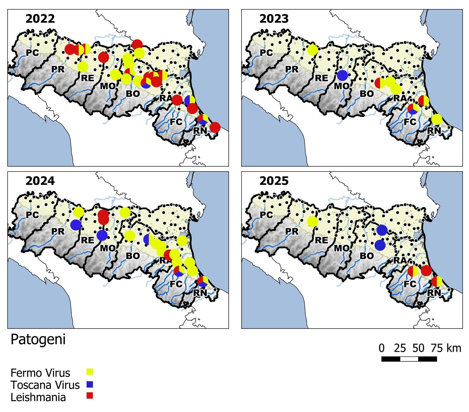 Nel 2025 si nota una netta diminuzione di incidenza dei patogeni rinvenuti (province di Parma, Forlì-Cesena e Rimini) legata al forte calo di densità di flebotomi in pianura. Resta comunque evidente che la co-circolazione dei diversi patogeni è stata individuata in tutti gli anni.
