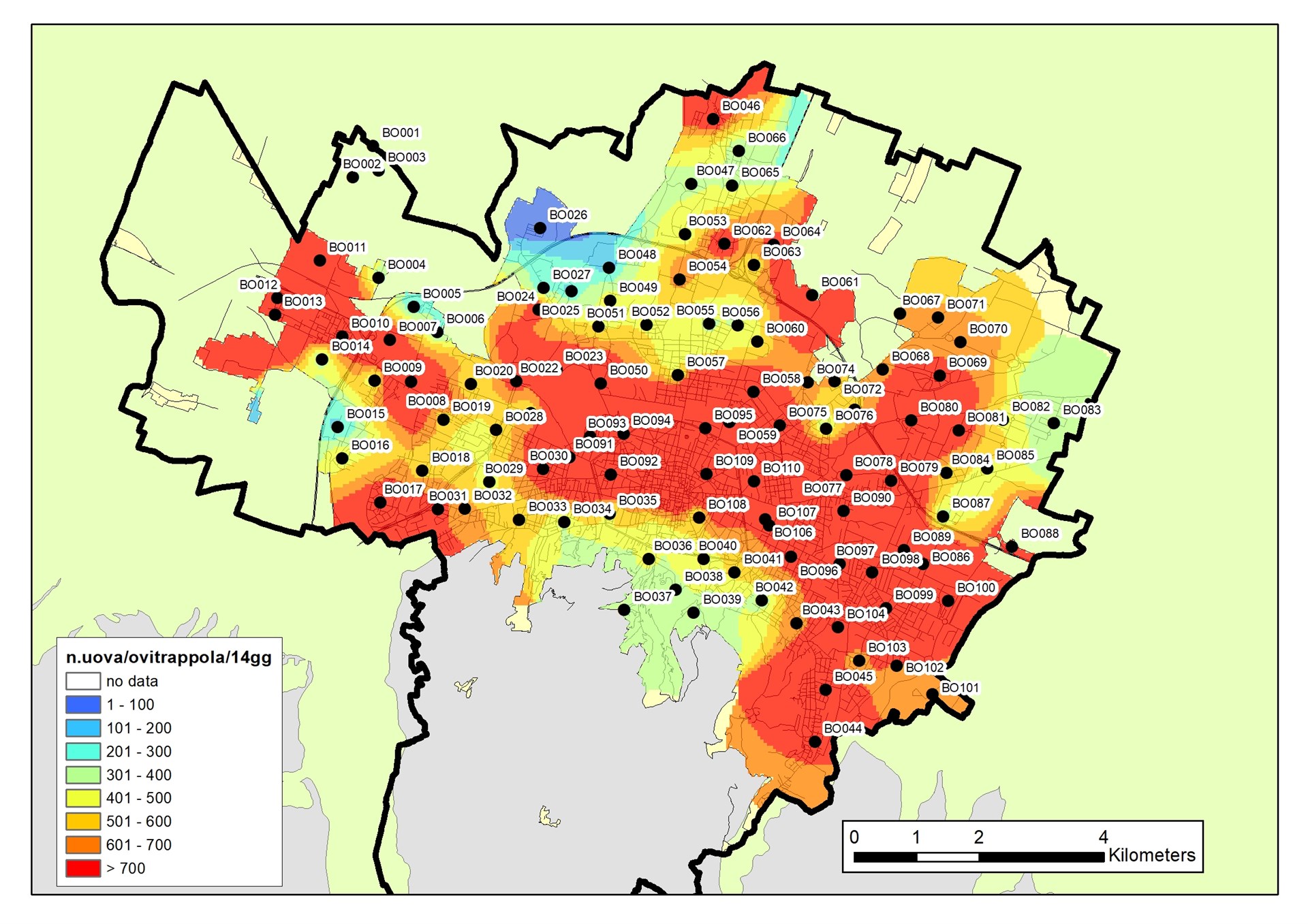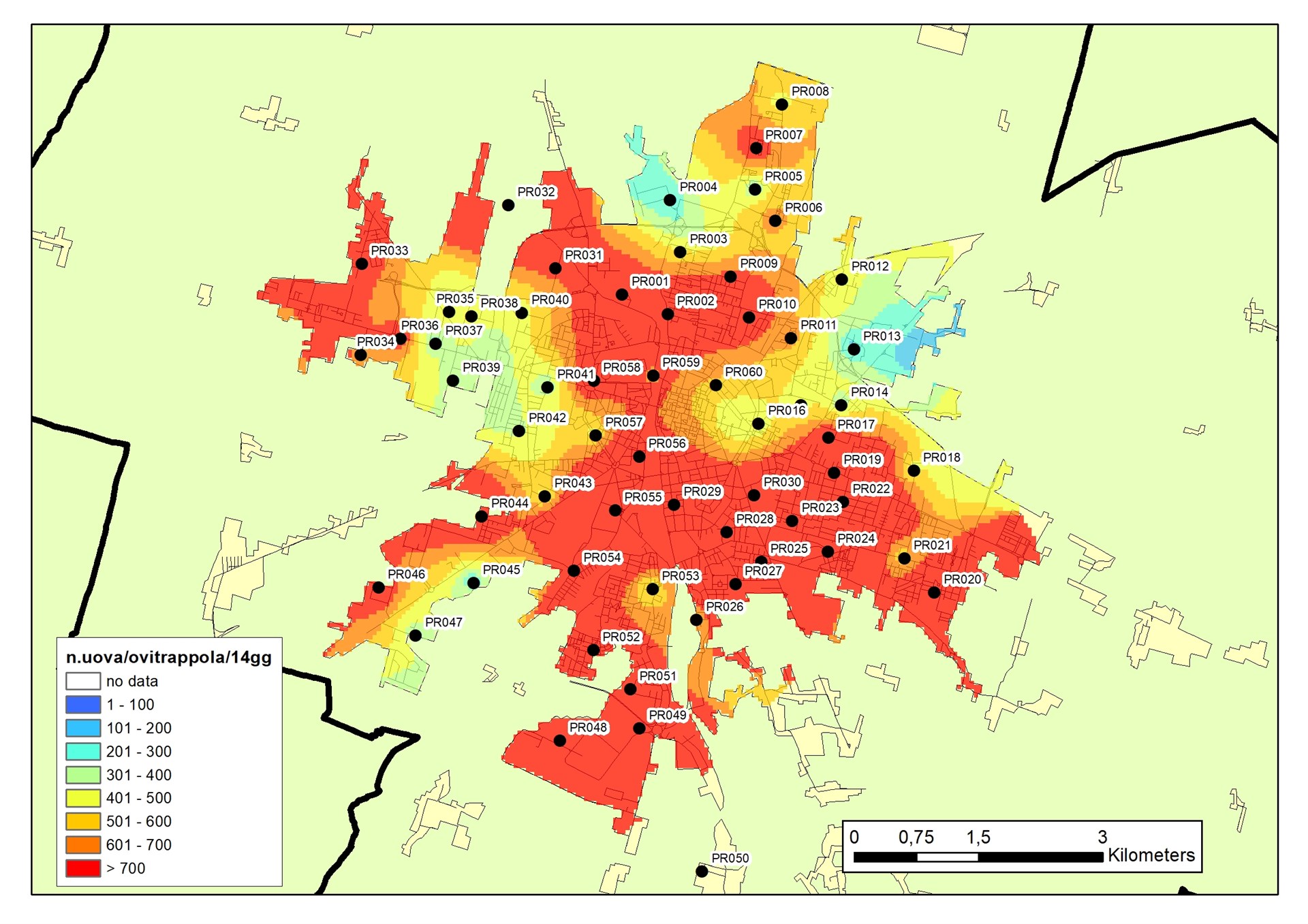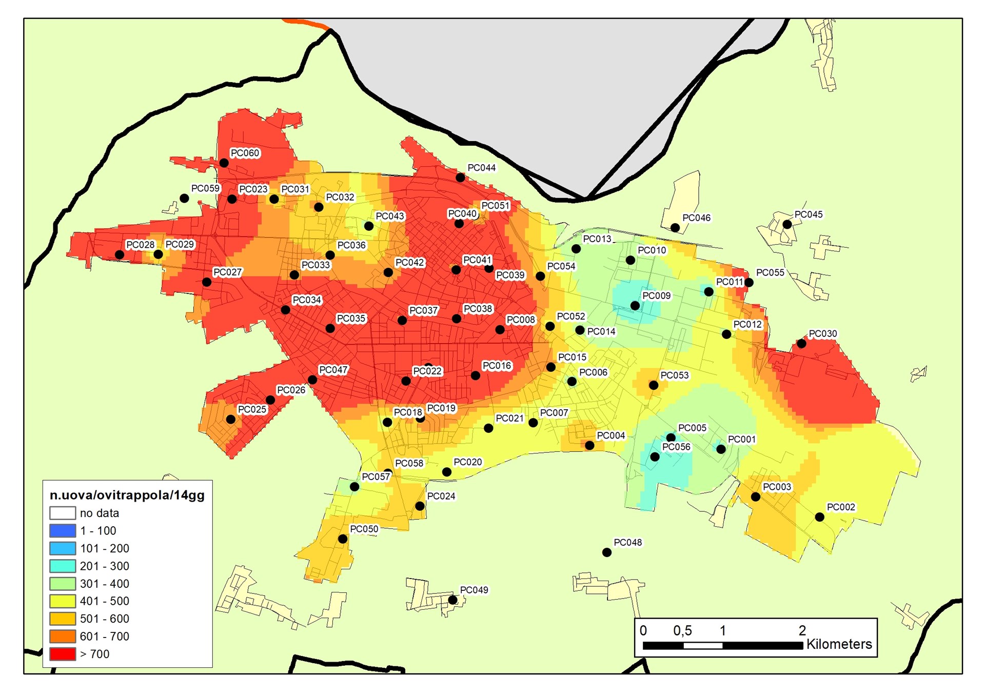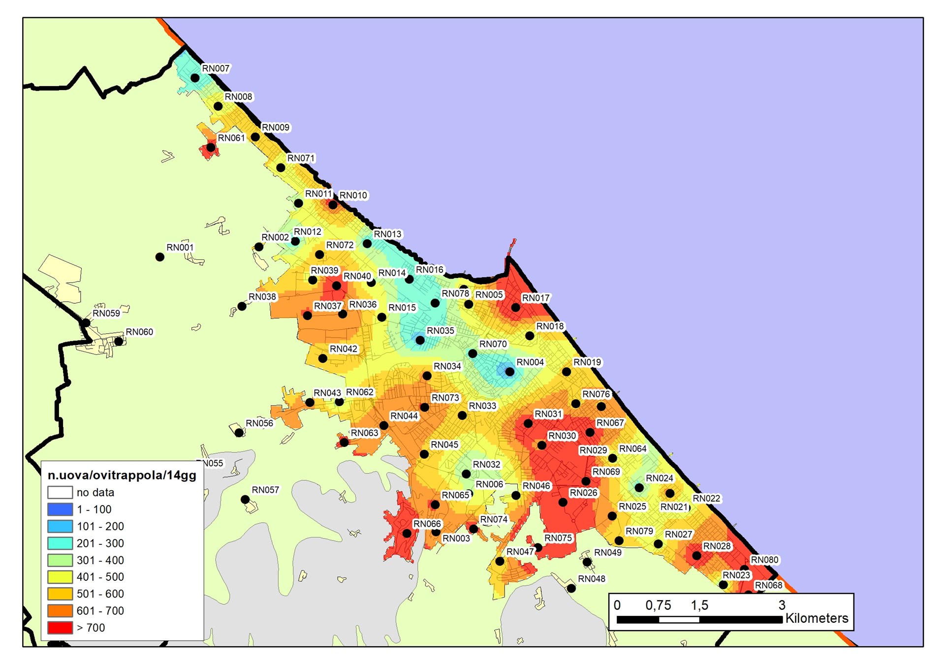 Utilizzando i dati delle ovitrappole vengono create mappe di distribuzione mensili da Giugno a Settembre per i 10 Comuni capoluogo sottoposti al monitoraggio della Zanzara Tigre.