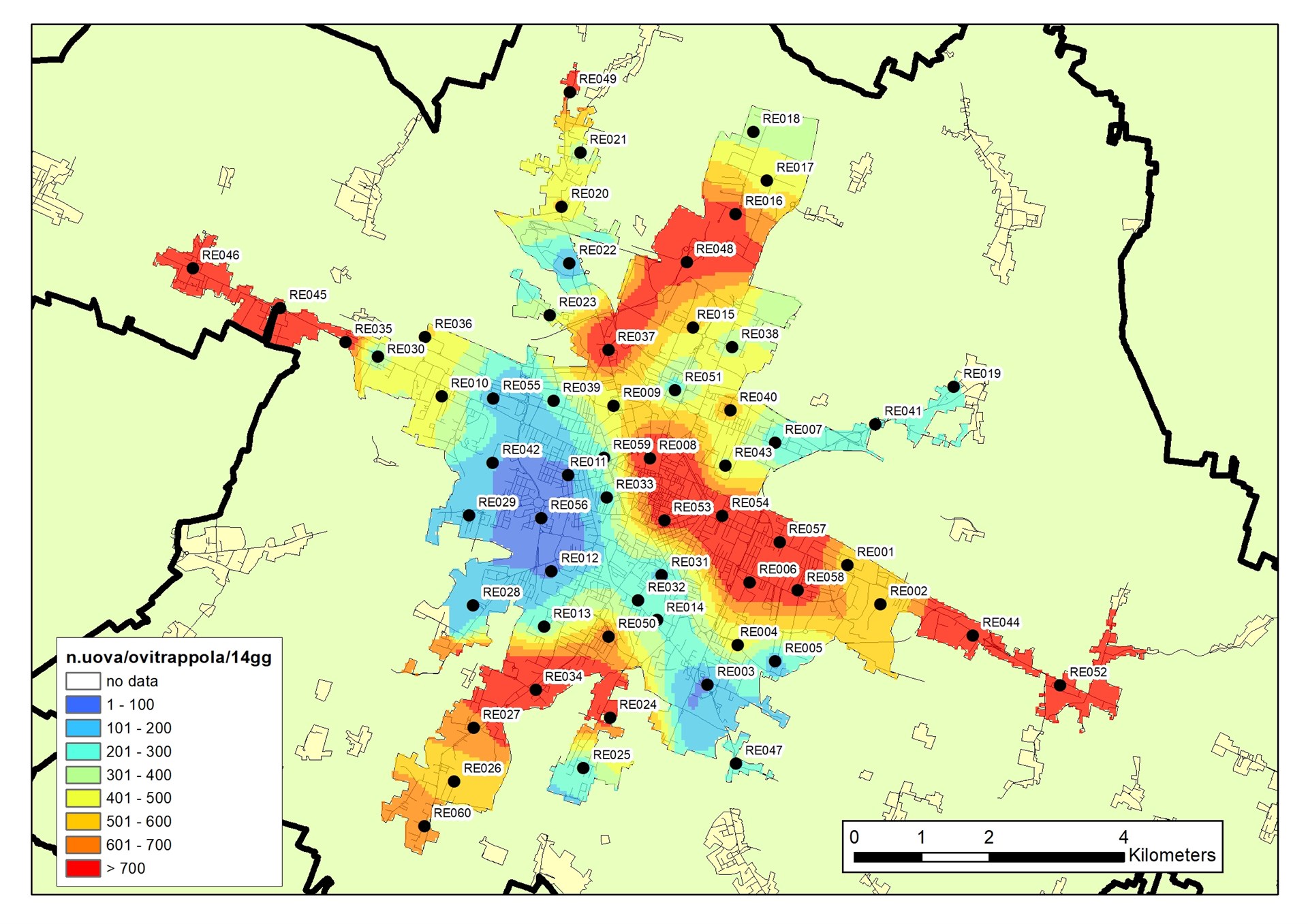Nelle mappe mensili prodotte vengono evidenziate con il colore rosso le aree a maggiore densità della specie (> 700 uova/ovitrappola/14gg) in cui i Comuni possono investire maggiori risorse sia economiche che umane per la lotta (es. attività Porta-a-Porta, sopralluoghi mirati, attività di maggiore comunicazione, banchetti informativi, ecc.) in quanto tali aree risultano con alta probabilità essere non solo zone in cui la molestia della specie è più elevata, ma anche zone in cui il rischio di trasmissione di arbovirus quali Dengue, Chikungunya e Zika è più probabile qualora vengano introdotti accidentalmente.