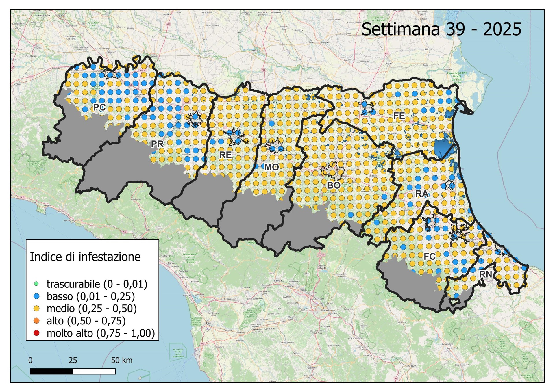 Le seguenti mappe mostrano con colori graduati l'Indice di Infestazione settimanale calcolato dividendo il numero di uova previsto tramite modello con il numero medio del massimo di uova calcolato negli ultimi 5 anni dai dati di monitoraggio con ovitrappole.