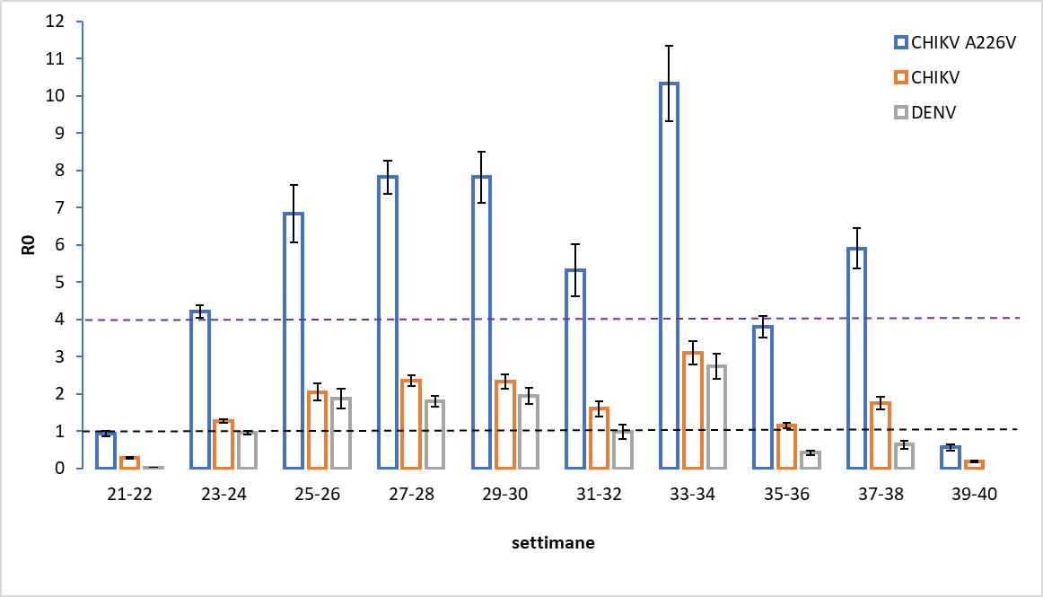 - per i due ceppi di chikungunya nelle settimane 33-34 (circa la seconda metà di agosto) viene raggiunto un picco di rischio con valori medi di R0 maggiori di 3 (CHIKV) e 10 (CHIKV A226V). Il ceppo mutato rimane superiore alla soglia di R0=4 per tutta l’estate a parte le settimane 35-36.
