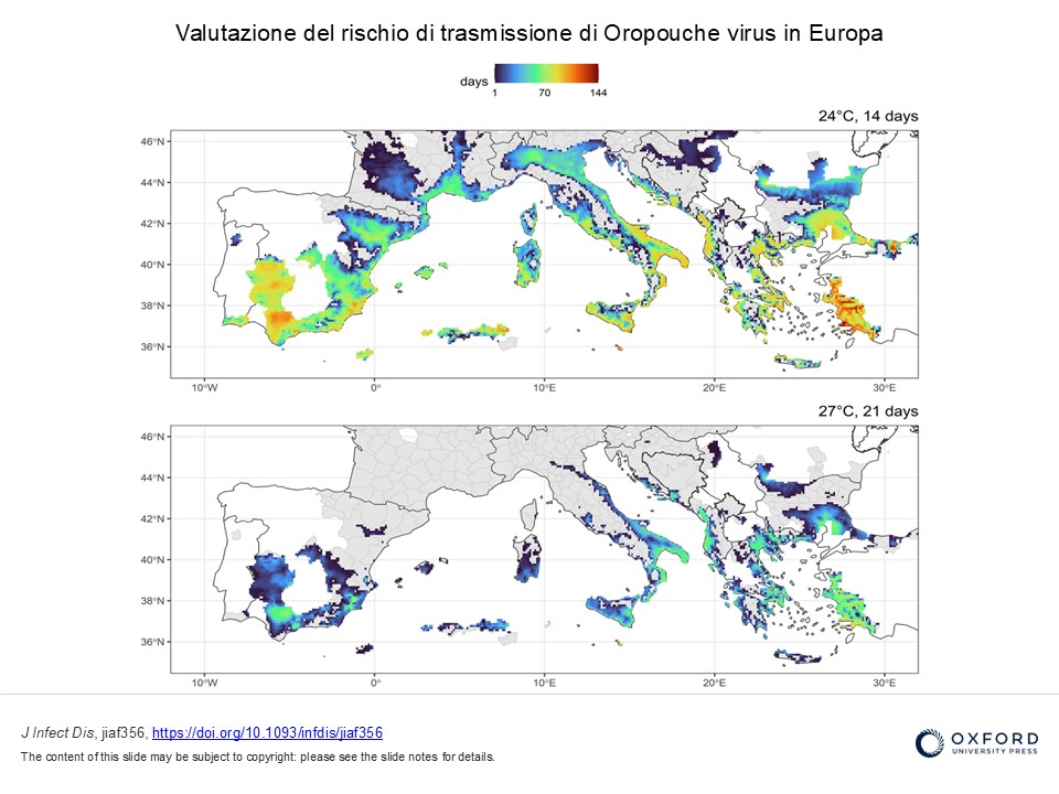 Attraverso un’analisi del rischio, basata sulla distribuzione geografica di Ae. albopictus, gli autori stimano che le regioni del bacino mediterraneo costituiscano aree potenzialmente idonee alla trasmissione locale di OROV, qualora il virus venisse introdotto.