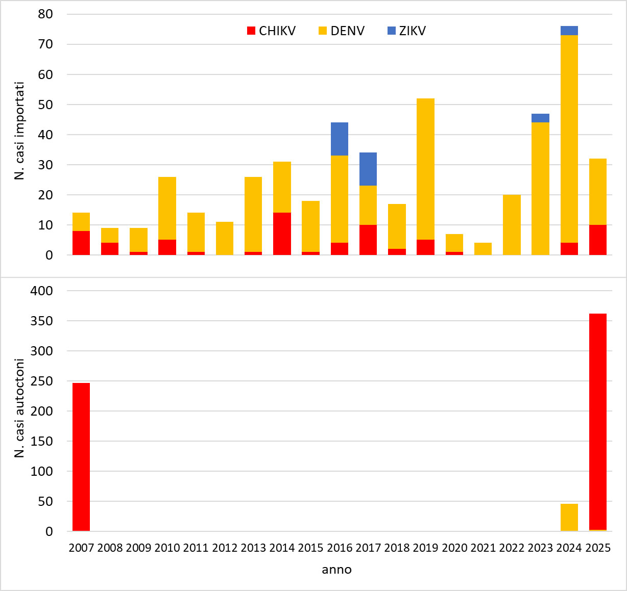 Diversamente i "casi autoctoni" totali di chikungunya sono aumentati rispetto al 2024 legati alle epidemie registrate a La Reunion e in Madagascar nel 2025.