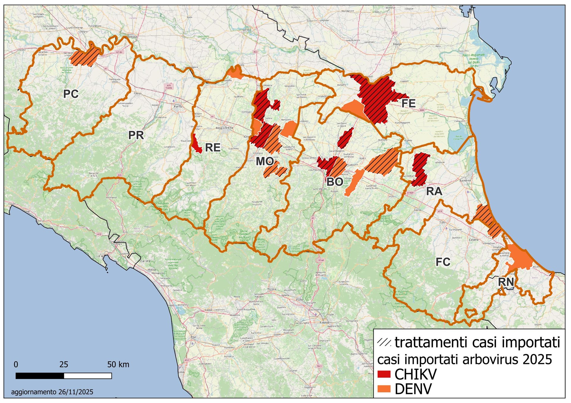 A fronte di oltre 1200 segnalazioni totali pervenute ai Dipartimenti di Sanità Pubblica, fino al 24 novembre 2025 sono stati confermati o classificati come probabili: 26 casi di Dengue (23 importati e 3 autoctoni), 371 casi di Chikungunya (11 importati e 360 autoctoni).