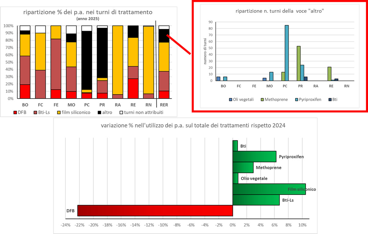 A livello regionale, i principi attivi maggiormente utilizzati sono stati quelli a base di film siliconico (37,9 %), in particolare nelle province di Rimini e Ravenna, seguiti da quelli a base di Bti-Ls (27,5%) maggiormente impiegati nelle province di Forlì-Cesena, Modena, Bologna e Ferrara. L'uso di Diflubenzuron rappresenta l’11% dei trattamenti, principalmente nelle province di Bologna e Reggio Emilia, verosimilmente come residuo di magazzino, in quanto il prodotto non è più disponibile sul mercato europeo.