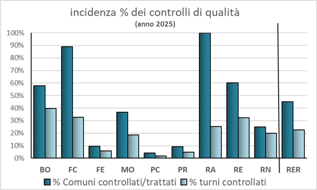 - le province con oltre il 50% dei Comuni sottoposti a controlli di qualità sono Ravenna, Forlì-Cesena e Bologna, come nel 2024, a cui si aggiunge Reggio-Emilia nel 2025;