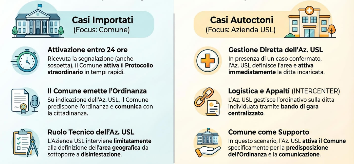 Per i casi importati, invece, l’attivazione del Comune da parte dell’Azienda USL avviene già al sospetto clinico; la gestione rimane in capo ai Comuni secondo le modalità ordinarie, che prevedono l’applicazione del protocollo straordinario di disinfestazione anche in assenza di conferma di laboratorio.