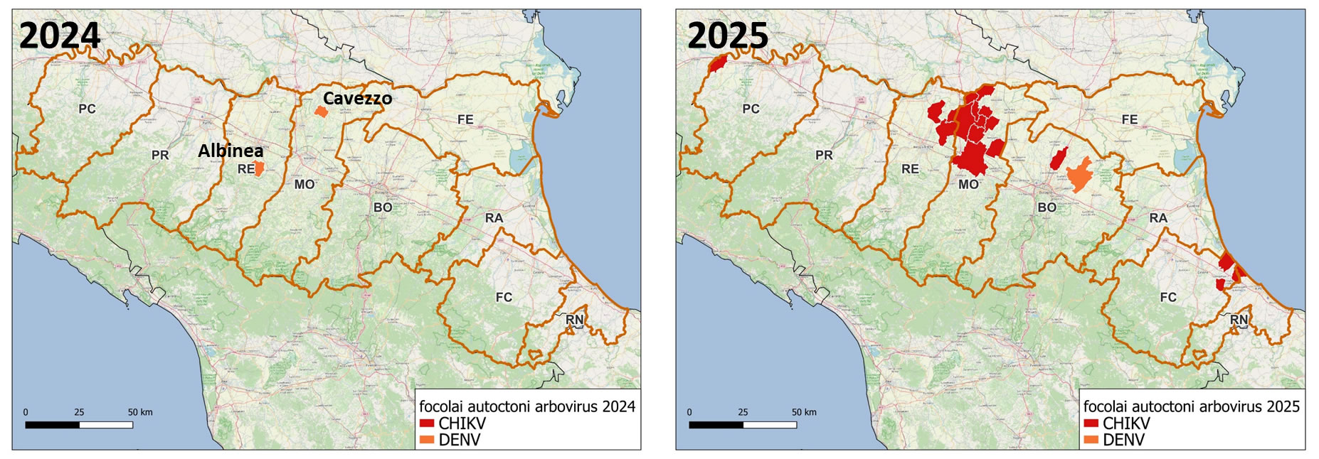 Dopo l’epidemia di chikungunya di Castiglione di Cervia (RA) del 2007, fino al 2023 in Emilia-Romagna si sono registrati esclusivamente casi importati di arbovirus di chikungunya e dengue. Nel 2024 si è verificato un cambiamento di scenario con la comparsa di due cluster autoctoni di dengue: uno ad Albinea (RE) e uno, più esteso, a Cavezzo (MO), con 35 casi confermati e 9 probabili, correlati al focolaio marchigiano di Fano (vedi poster). Nel 2025 il quadro si è ulteriormente intensificato con diversi episodi di dengue e chikungunya distribuiti sul territorio regionale e, soprattutto, con un ampio focolaio di chikungunya con epicentro a Carpi (MO) e diffusione in più comuni e province della Regione.