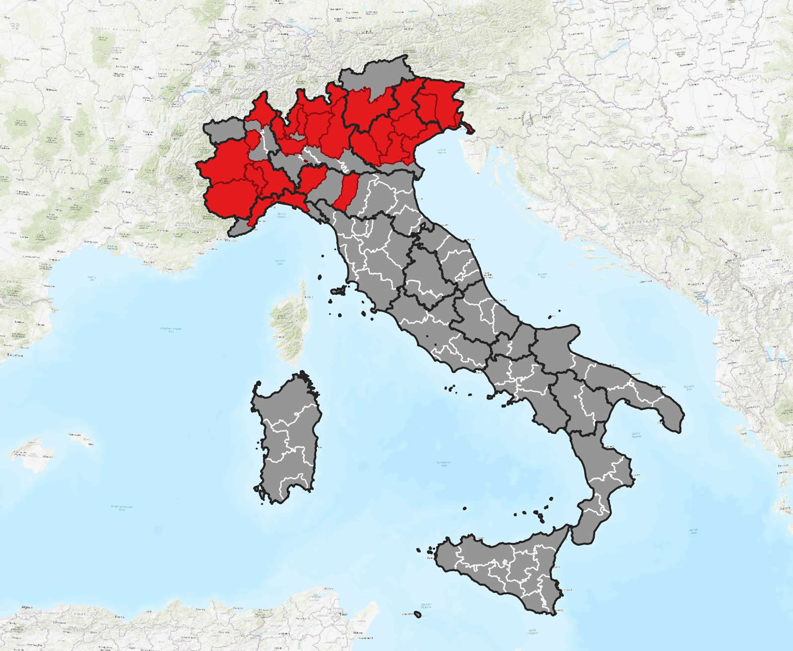 Nel 2011 è stata individuata inizialmente in provincia di Belluno, si è poi diffusa in Friuli Venezia Giulia, nella provincia di Trento, in Lombardia (ai confini con la Svizzera) e nel 2015 nella provincia di Genova. Nel 2020 ha fatto la sua comparsa anche nella provincia di Bergamo. Nel 2021 è stata rinvenuta in Piemonte.